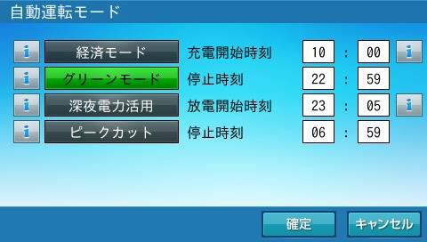 充放電の運転時間は、初期設定で、経済モードでのご使用に適した設定になっています。グリーンモードでのご使用に合わせた時間設定に変更してください。