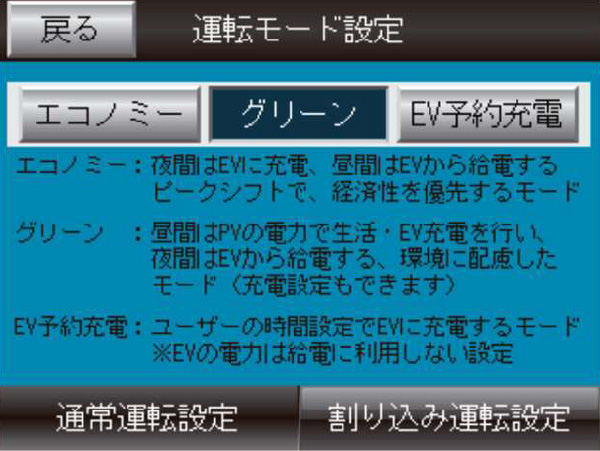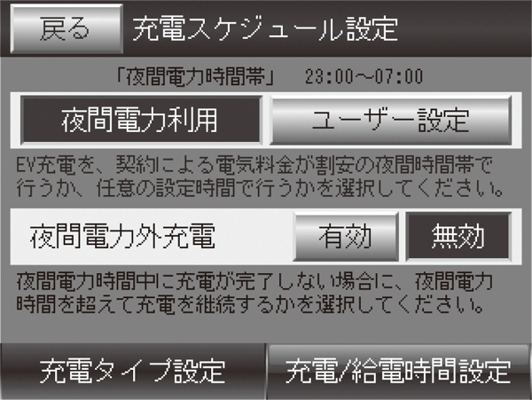 - 充電時間/給電時間を変更する場合は、一旦「いいえ」を押して、「戻る」→「充電スケジュール設定」から変更後、再度グリーンモードを設定してください